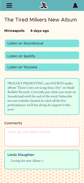 Here are my designs for an app called Jam Local. The goal was to make an easy and modern way for musicians to find each other locally for jam sessions, band auditions, gear trading, and any other writing, playing, or collaborating you could want from your local music scene. All important text meets, at minimum, AA WCAG web accessibility standards, and most of it passes AAA too.